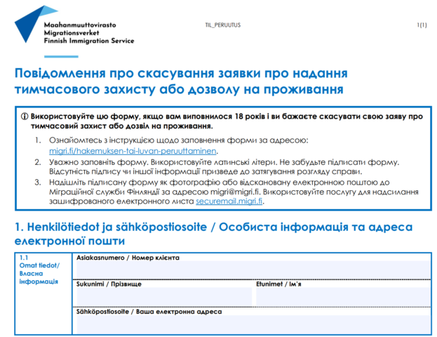 Якщо ви залишаєте Фінляндію і не збираєтеся повертатися. Скасуйте свою заявку на отримання тимчасового захисту або дозвіл на проживання на сторінці Міграційної служби за посиланням: https://migri.fi/uk/vidklikanna-zaavi-abo-skasuvanna-vasogo-dozvolu